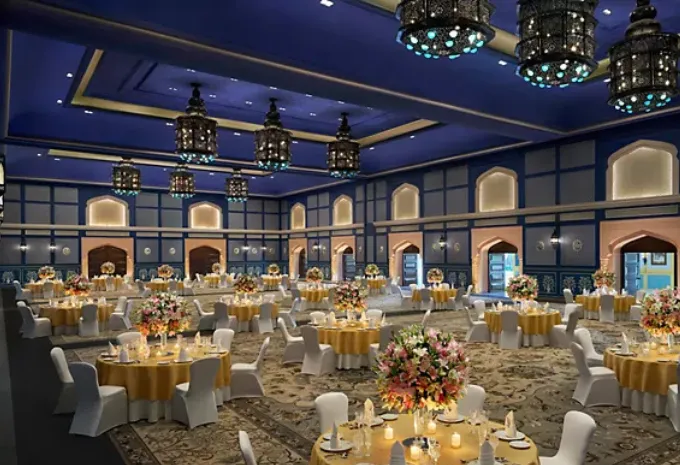Fairmont Jaipur, nestled in Kukas, offers an opulent setting for your dream wedding. With 245 luxurious rooms and suites, it ensures a comfortable stay for your guests. The venue boasts multiple event spaces, including two expansive lawns and a grand ballroom, accommodating up to 3,000 guests. Couples can choose from curated wedding packages that encompass venue rental, catering, décor, and accommodations, ensuring a seamless celebration. Culinary offerings range from ₹4,300 to ₹4,500 per plate for vegetarian and non-vegetarian meals, respectively. For a two-day wedding with 200–300 guests, the estimated cost ranges between ₹1.5 crore and ₹2.5 crore, depending on customization and additional services.
